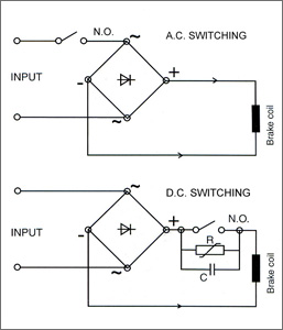 Switching of the brake can be on either side. However, once application demands, higher switching frequency / faster engagement and disengagement time, switching must be carried out on D.C. side. To restrict the high inductive voltage / back EMF a suitable supressor and capacitor network is provided across the contactor coil.