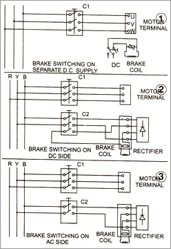 In figure 2, switching is carried out on DC side. Once braking of the motor takes place intermittently, DC switching must be carried out. A Resistor and Capicitor network must be connected across the brake coil and parallel to it.